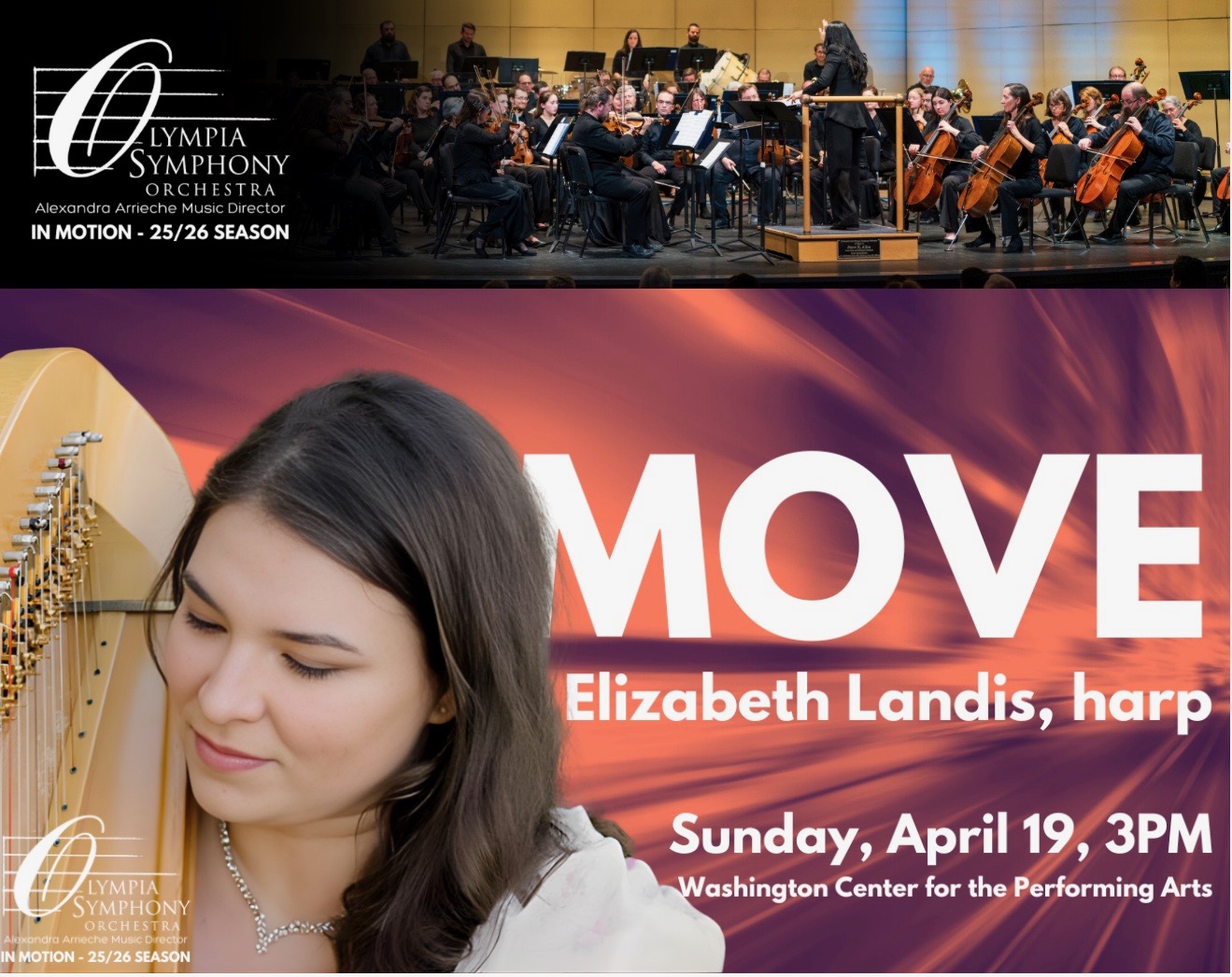 I’m excited to be joining the flute section for this Season Finale concert, featuring a bold and rhythmic Harp Concerto by Ginastera, and the timeless and powerful Symphony No. 5 by Shostakovich. Both composers created these works under pressure, and they communicate a message of struggle, hope and strength that is so relevant today. Alexandra Arrieche leads the Olympia Symphony Orchestra in a concert that will MOVE you!